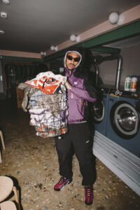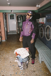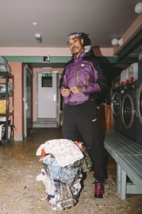 We’ve moved from lounging on the grass to washing our clothes and cleaning up our image. A paisley North Face hoodie sits in the washing basket, part of KOJ’s evolving look. Sunglasses add to the ‘ready for anything’ vibe, paired with his waterproof coat.