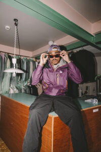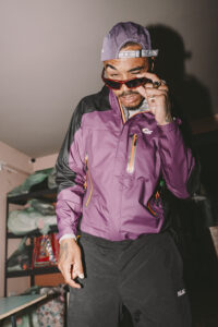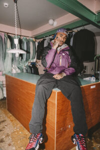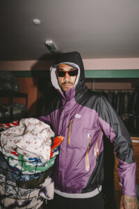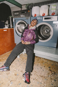Draped in a Gore-Tex jacket, KOJ exemplifies the “Gorp” style—utilitarian, functional, and outdoorsy. “It’s a nod to North Liverpool’s old-school style,” explains Rhys, our on-scene stylist. KOJ got his Lowe gear from local reseller Karlos.Kargo, maintaining a relationship that sustains the community fashion space.