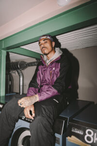 Rhys draws inspiration from Goldie, a Stussy icon. “KOJ is having fun, looking street, and embracing his scally roots,” Rhys laughs. Goldie’s tough-guy look with a smile influences KOJ’s balance of edge and approachability.