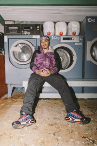 KOJ is notorious for rocking the freshest outfits, and today’s look showcases the North-South fusion of Liverpool’s street fashion. The Greenbank-born rapper, a head-turner in the Scouse rap scene for years, holds a box of Flash washing powder, embodying a playful yet polished vibe.