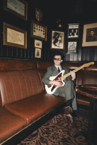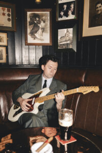 MT Jones dresses sharp, balancing formal and informal effortlessly. His tailored suit ensures the sleeves don’t overlap the guitar’s neck. His hair, cut in local Liverpool barbershop John Clue, is a sweep-back 60s style he maintains with a bit of gel, brand unspecified—highlighting his carefree, effortless vibe.