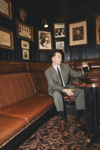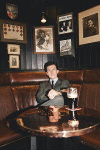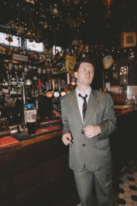 His sunglasses, a modern frame with a classic look, are from Barcelona by El Bourne/Charlie Therapy. He adjusts his tie—a clip-on from Rhy’s nan, who served in the Liverpool police force—while ordering a Guinness and chatting with the pub landlady.