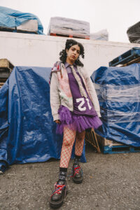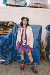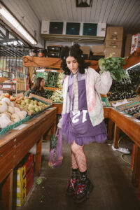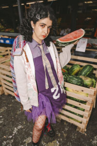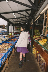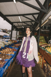 Dressed for “a summer festival,” as their stylist Rhys describes, Nil00’s look suits both stage and street. But we’re at the L7 Market in Kensington, Liverpool. Even artists need their five-a-day, and this shoot really “ate.” It’s 11 am, and shoppers are busy picking up shallots and bright red peppers in the light rain. “Every aspect of the outfit is formal, but altered,” says Rhys, as he and Nil00 tweak the look with purple pins and coloured laces. Nil00 debates over vintage ballet shoes, and five minutes later, the look is complete.