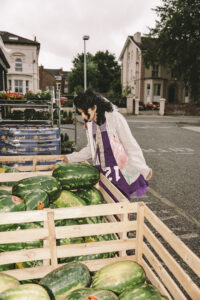 The standout piece is the “T-skirt,” a vintage tracksuit top turned into a mid-length skirt by Gina Corrieri (@ginacorrieri_), an independent designer from North London. “I love supporting small businesses; they often produce the most interesting stuff,” Nil00 comments. Their garish purple outfit clashes fantastically with the everyday market bustle but matches the aubergines perfectly. Suddenly, I crave baba ghanoush.