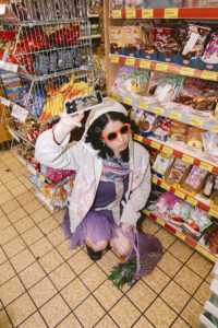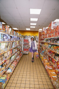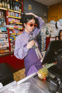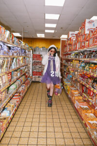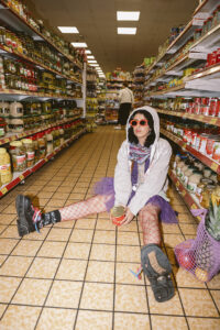 We’re in a supermarket, and the look isn’t practical, but it’s iconic. It’s paparazzi—the rush of a supermarket sweep. Nil00 shops here, and today, in their artist guise, they’re unfazed, much like their music. It’s unapologetic, surreal, silly, tongue-in-cheek, and beautifully obnoxious.